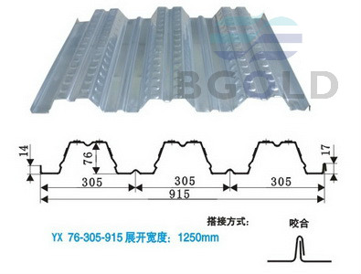 YX76-305-915鍍鋅樓承板也叫壓型鋼板、鋼承板、鋼樓承板,是76mm波高3W樓承板最常用板型。其波高76mm,波寬305mm,有效寬度為915mm。其采用1250mm熱鍍鋅鋼板為基材,經機器輥壓成型。主要用做樓層板,具有強勁的砼握裹力,更優越的結構斷面性質和耐火性能,使用階段:可代替底部受拉鋼筋,施工階段:可代替模板。廣泛應用于工業與民用建筑的樓面,大型公共建筑的高層樓面結構等,具有造價低、節約鋼筋、強度高、更長使用年限等特點.