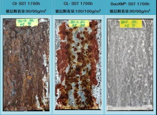 根據戶外掛片結果,BaoXM®鍍層在典型海洋氣候、酸雨氣候均表現出較熱鍍鋅、鍍鋁鋅更強的環境耐蝕性。
