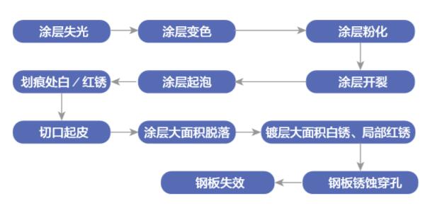 彩涂鋼板的失效過(guò)程如下圖所示,涂層失效、鍍層失效乃至鋼板穿孔是關(guān)鍵的腐蝕發(fā)生過(guò)程。因此提高涂鍍層厚度,且采用耐候、耐蝕涂鍍層是最有效的防止彩涂鋼板腐蝕失效的手段。