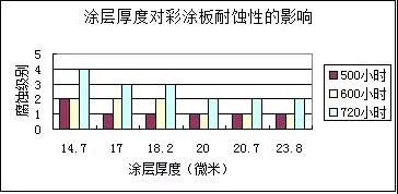 從微觀上講、涂層是多空的組織??諝庵械乃?、腐蝕介質(zhì)(氯離子等)就會通過涂層的薄弱部分侵入,造成膜下腐蝕,進而涂層起泡并剝落。另外,即使同樣涂層厚度,二次涂層要比一次涂層致密。根據(jù)國外報道和相關(guān)腐蝕試驗結(jié)果,正面涂層20μm以上才能有效的防止腐蝕介質(zhì)的侵入,由于底漆和面漆的防腐蝕機理不同,不僅要規(guī)定總膜厚,還有分別要求底漆(》5μm)和面漆(》15μm)的厚度,只有這樣,才能保證彩涂鋼板不同部位的耐蝕性是均衡的。