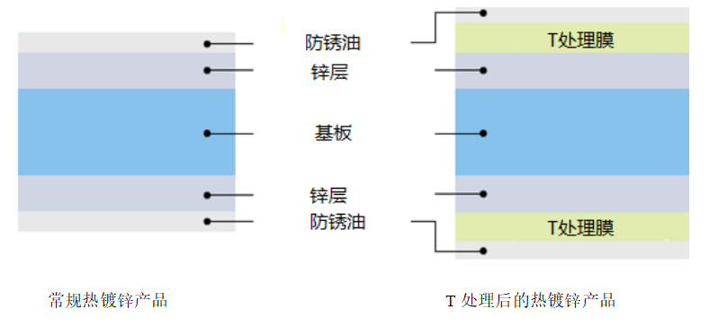 熱鍍鋅鋼板因其具有優越的耐腐蝕性能與表面質量,及良好的焊接性與涂裝性,成為中高檔乘用車鋼板的主流材料。由于鍍鋅層的特性,普通熱鍍鋅板在沖壓成形時,容易產生鋅層表面劃傷、粉化脫落、模具粘鋅現象,沖壓穩定性較差,影響沖壓件表面質量。故此為滿足國內外用戶需求,寶鋼在國內率先開發了無機固體自潤滑處理(T處理),該產品通過表面輥涂處理方式,在熱鍍鋅材料鋅層表面形成超薄的“無機自潤滑層”。