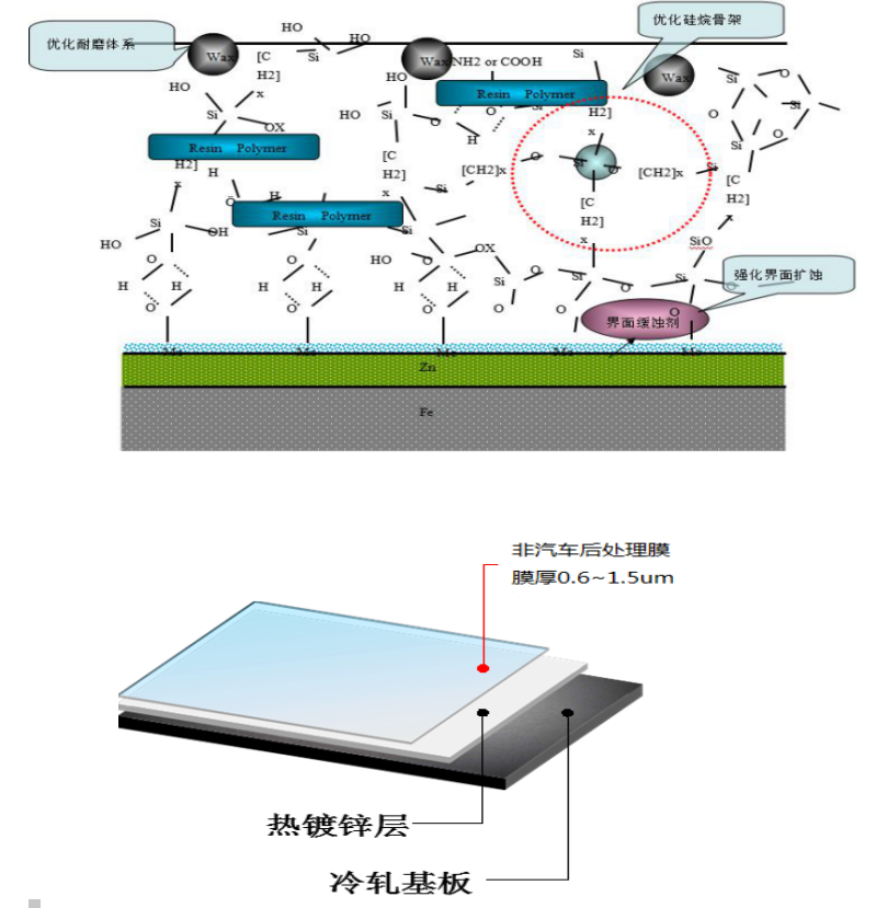 目前湛江冷軋能生產的產品有鈍化、耐指紋以及家電自潤滑三種,膜厚從0.6~1.5um不等,綠色環保,其結構皆以硅烷基來作為骨架,有機物作為主要填充物,加入性能改良物質如表面耐磨劑等改善所需的性能指標,膜結構圖和斷面示意圖如下: