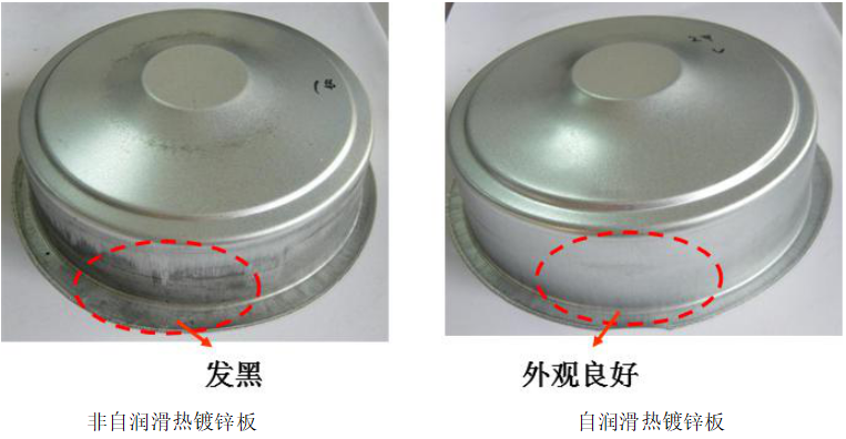 故此自潤滑處理后,帶鋼沖壓潤滑性能優秀,沖壓拉伸面不易變黑,適合無油沖壓,減少了清洗等環節,與常規鈍化、耐指紋處理的材料相比,能消除材料的沖壓不良現象,如下圖所示。