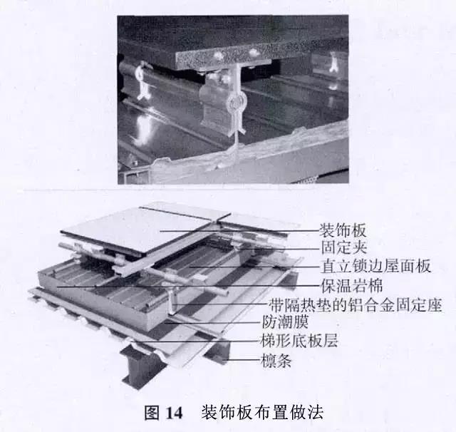 裝飾板系統(tǒng)的連接固定,無(wú)需在鋁鎂錳合金板上開(kāi)洞;兩層板之間的開(kāi)放式連接,無(wú)需維護(hù),并可降低清理要求;可調(diào)節(jié)系統(tǒng)使裝飾板可完美布置,裝飾板布置做法見(jiàn)圖14。